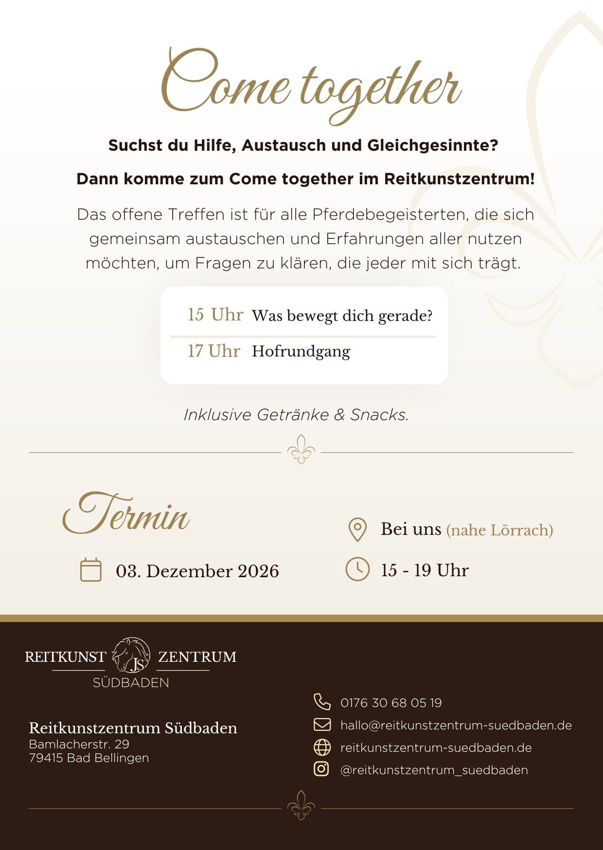 Dann komme am Samstag, den 06. September zum Come together ins Reitkunstzentrum!